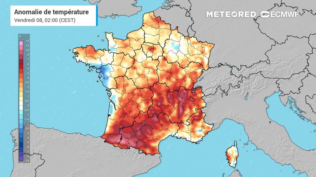 Vendredi après-midi, les températures prévues atteindront jusqu’à 40°C à Montauban et Agen, 39°C à Toulouse et Auch, 38°C à Bordeaux, 37°C à La Rochelle, Clermont-Ferrand, Lyon et Tarbes, 36°C à Limoges et Grenoble, 35°C à Aurillac et Bourges, 33°C à Tours, 31°C à Nancy, Strasbourg et Paris, 30°C à Alençon et Toulon, 29°C à Perpignan, 28°C à Rennes, 26°C à Rouen, 23°C à Brest, 22°C au Havre et 21°C à Cherbourg.