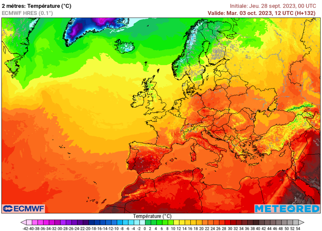L'air chaud sera situé entre l'Est de l'Allemagne et l'Europe Centrale en passant par la Pologne. L'Espagne ne sera pas en reste puisque de fortes chaleurs seront encore d'actualité. A l'inverse, fraîcheur un peu plus vive sur le Nord des îles britanniques.