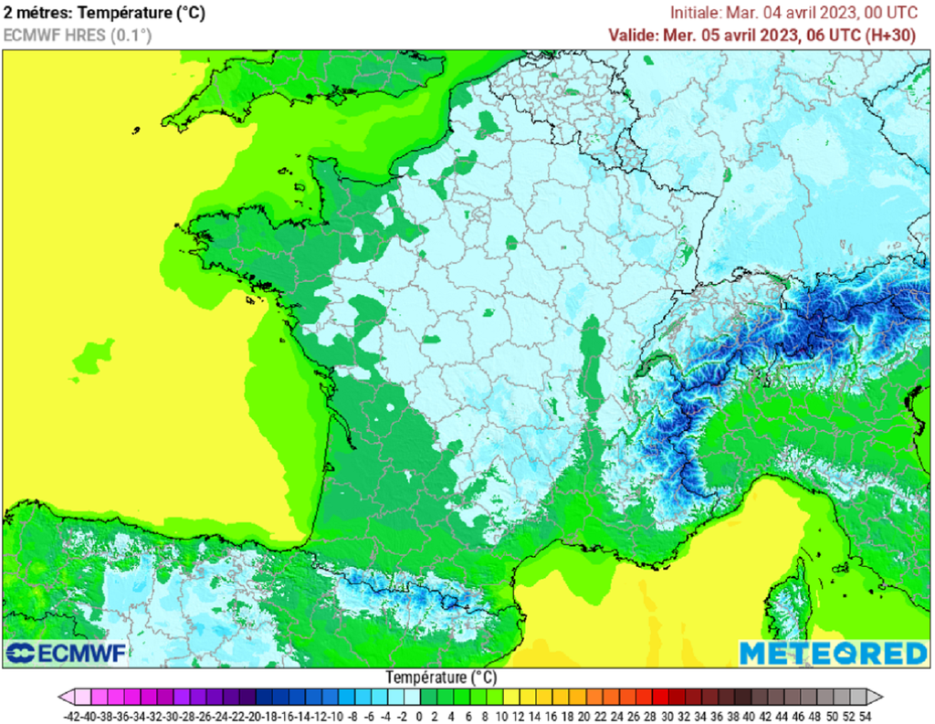 Les températures négatives de cette semaine sont bien la preuve que l’hiver n’a peut-être pas encore dit son dernier mot… Comme l’année dernière, comme en 2021, en 2019 ou en 2017, le froid a fait son retour ces derniers jours avec un mercure nocturne repassant dans le négatif. Ce mercredi s’annonce comme la matinée la plus froide de la semaine avec des minimales de l’ordre de -4 à 0°C sur les deux tiers du pays. Si ce gel tardif inquiète les arboriculteurs ou les viticulteurs, la situation est nette moins critique que l’année dernière à la même époque. Ainsi, le 4 avril 2022, la moyenne nationale affichait au petit matin -1,5°C selon la valeur obtenue à partir de la moyenne sur 30 stations météo représentatives. Cette valeur était tout simplement inédite en avril depuis la prise en compte de cet indicateur thermique national, en 1946. Le précédent record datait du 12 avril 1986 avec -1,4°C. Parmi les autres valeurs remarquables, on notera les -6°C de Nancy (Meurthe-et-Moselle) qui correspondent à la nuit la plus froide de toute la saison hivernale ou encore le 0°C tout pile de L’Île-d’Yeu, marquant le 1er jour de gel en avril sur l’île vendéenne depuis le début des relevés en 1944.