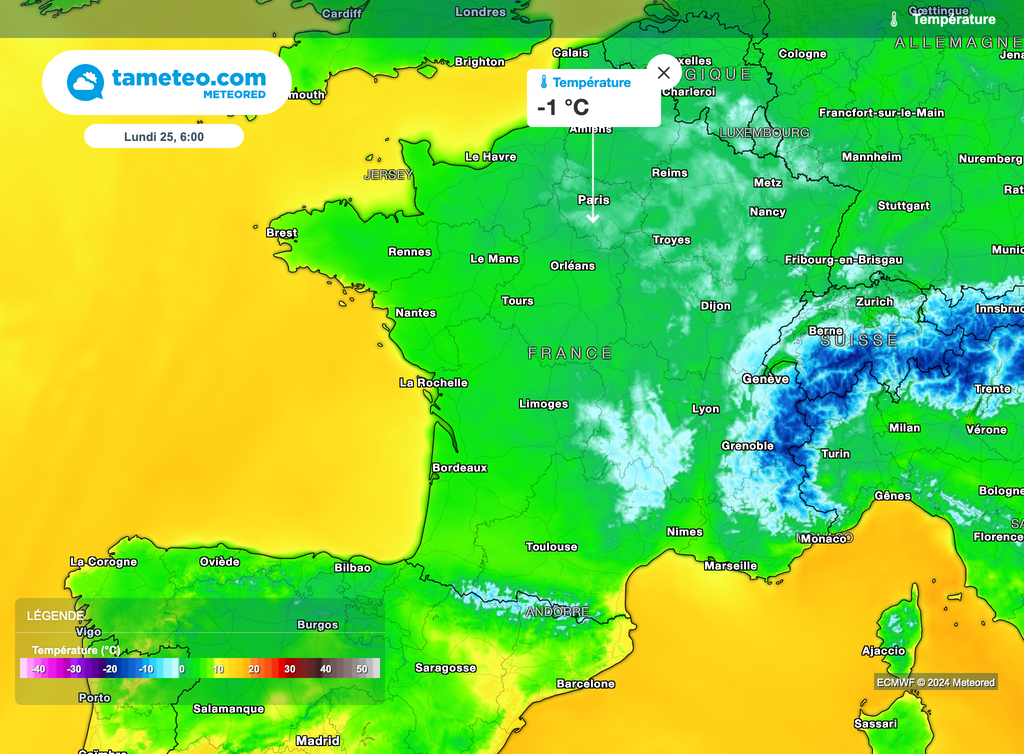 Seul le littoral atlantique connaîtra une grande douceur avec près de 10°C au réveil. Le pourtour méditerranéen sera aussi sous une douceur similaire, Corse comprise.