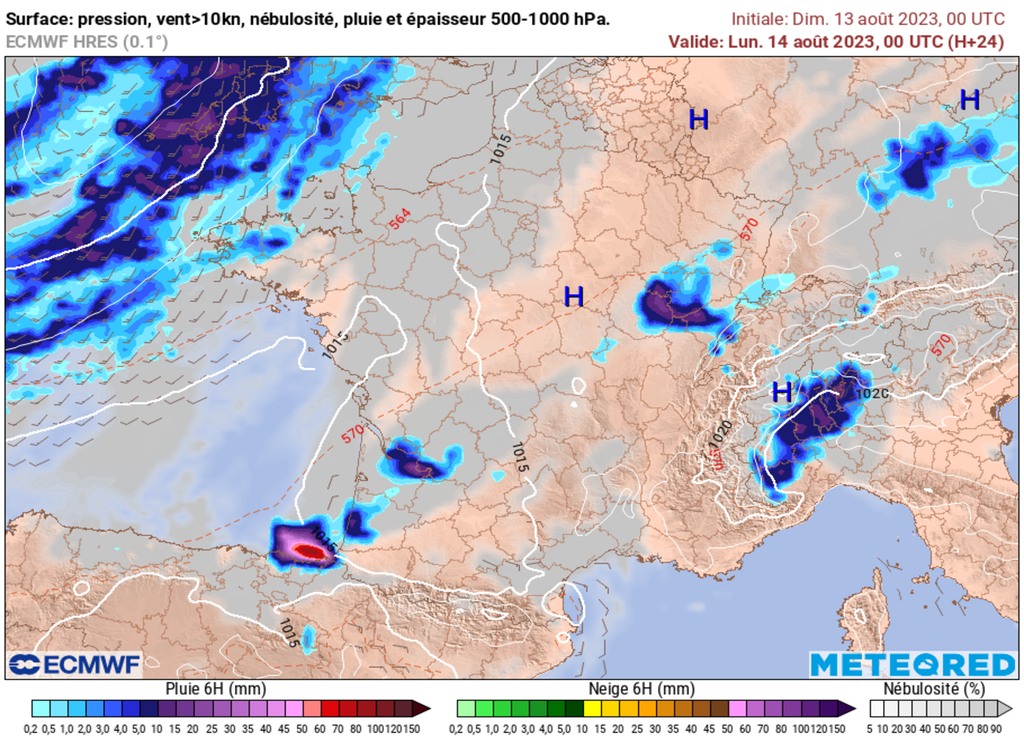 Au plus tard dès ce début d'après-midi, les conditions météo vont tourner à l'orage en direction de l'Est de la Nouvelle-Aquitaine. Cette région verra en effet les premiers foyers orageux de la journée avec le massif des Vosges et le Jura. Rapidement, des averses orageuses prennent place sur l'ensemble des reliefs français.