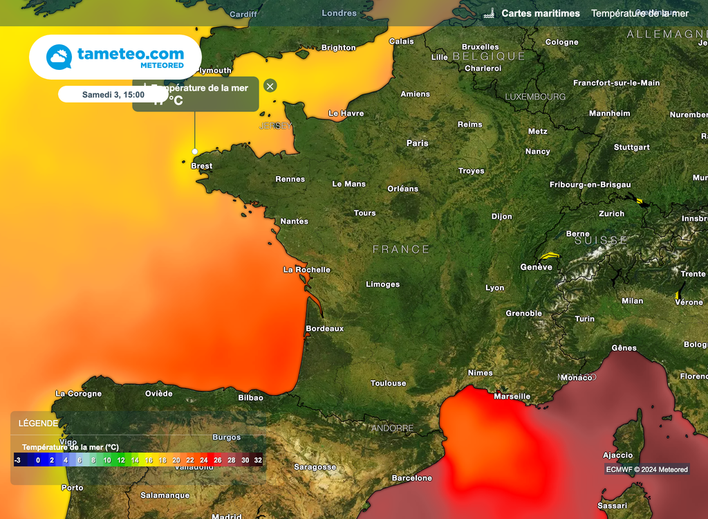 Cette semaine a été marquée par un air surchauffé au-dessus d'une large moitié sud de la France. Cela a participé à faire chauffer les eaux notamment de la Méditerranée. Ainsi, on pourra retrouver des valeurs de l'ordre des 28 à 29°C au large de la côte d'azur ! Des eaux très chaudes qui seront aussi présentes autour de la Corse.
