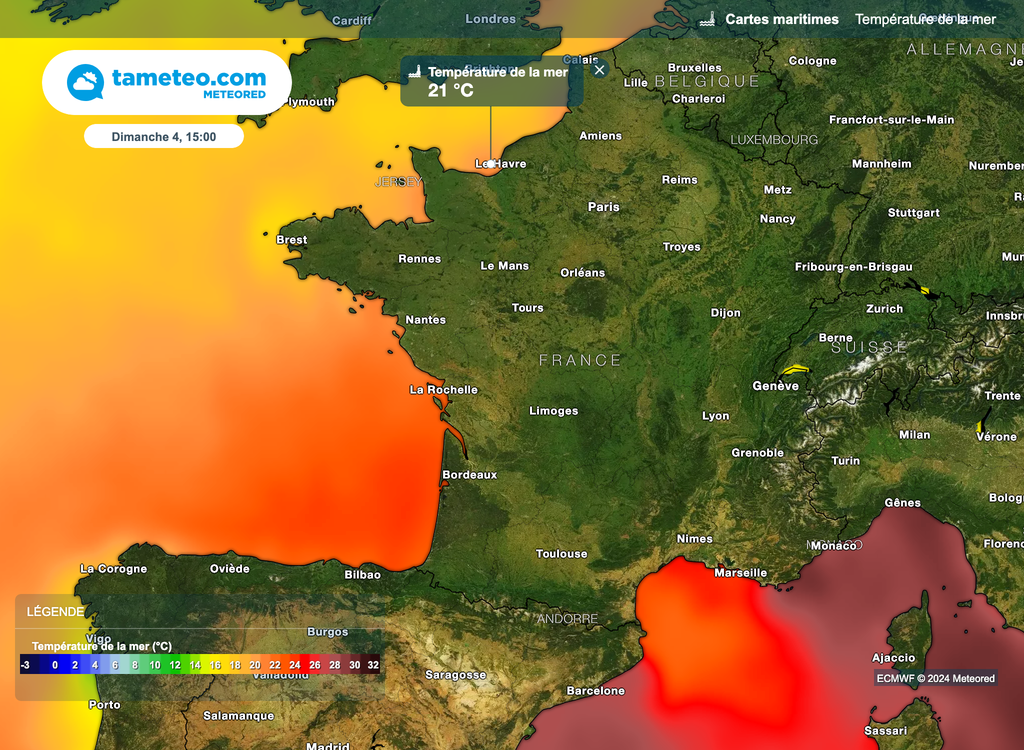 Une masse d'eau un peu plus fraîche concernera la Bretagne et les côtes de la Manche avec des valeurs de l'ordre des 17 à 20°C. Localement, des pointes à 21-22°C peuvent s'observer le long des cotes de la Manche.