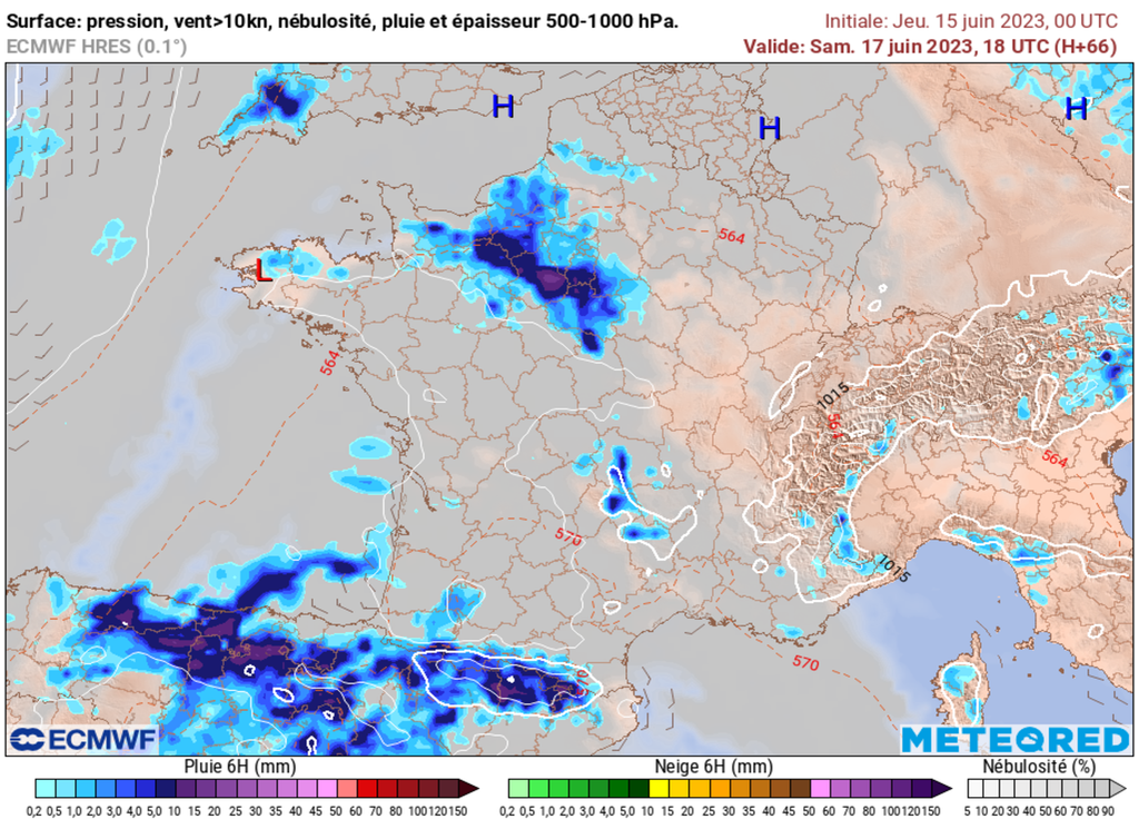 C'est donc dès la journée de samedi que ces intempéries prennent place mais en direction de le Bretagne du moins en première partie de journée. Dans le courant de votre après-midi et soirée de samedi, l'instabilité sera présente entre Normandie et Île-de-France ainsi qu'en direction du relief pyrénéen.
