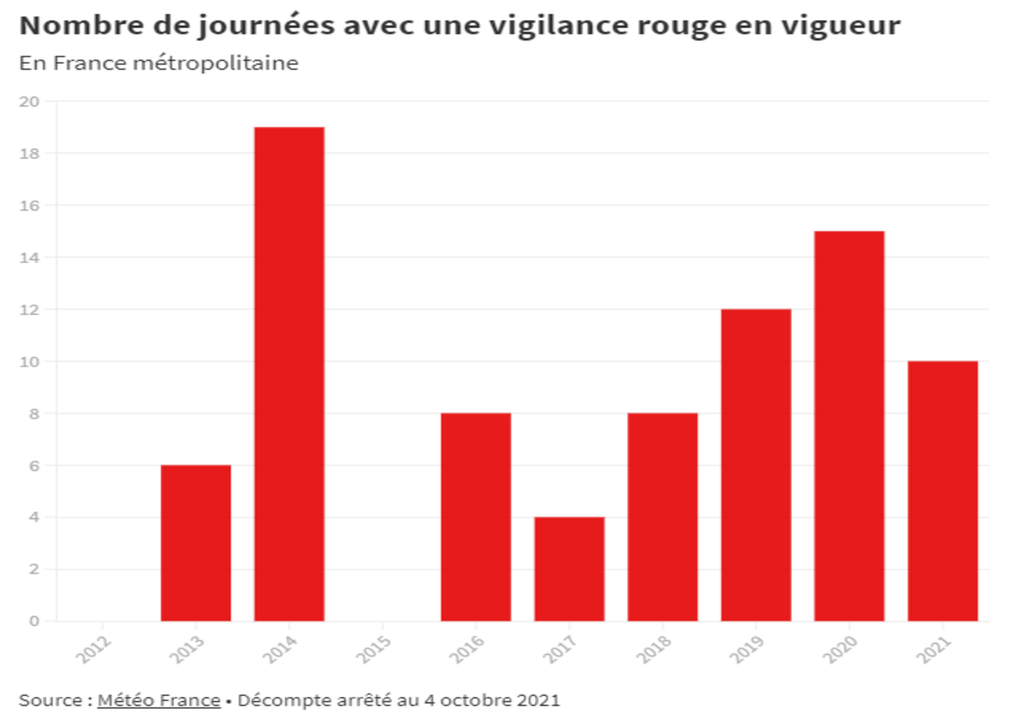 D’après un bilan effectué par Météo France, en moyenne, notre pays voit un de ses départements être placé sous vigilance rouge 8 jours par an depuis 2012. Soit 8 fois plus qu’entre 2002 et 2011 où on comptait seulement 1,4 jours. Les épisodes de fortes pluies et les inondations qui y sont liées sont les phénomènes météorologiques qui ont nécessité le plus de bulletins de vigilance rouge en France métropolitaine entre 2012 et 2021. Sur la période au total, on compte 31 jours sous vigilance rouge pour le risque « pluie-inondation », tandis que 27 étaient liées au seul risque d’inondations.