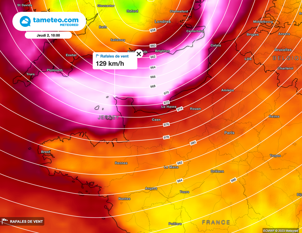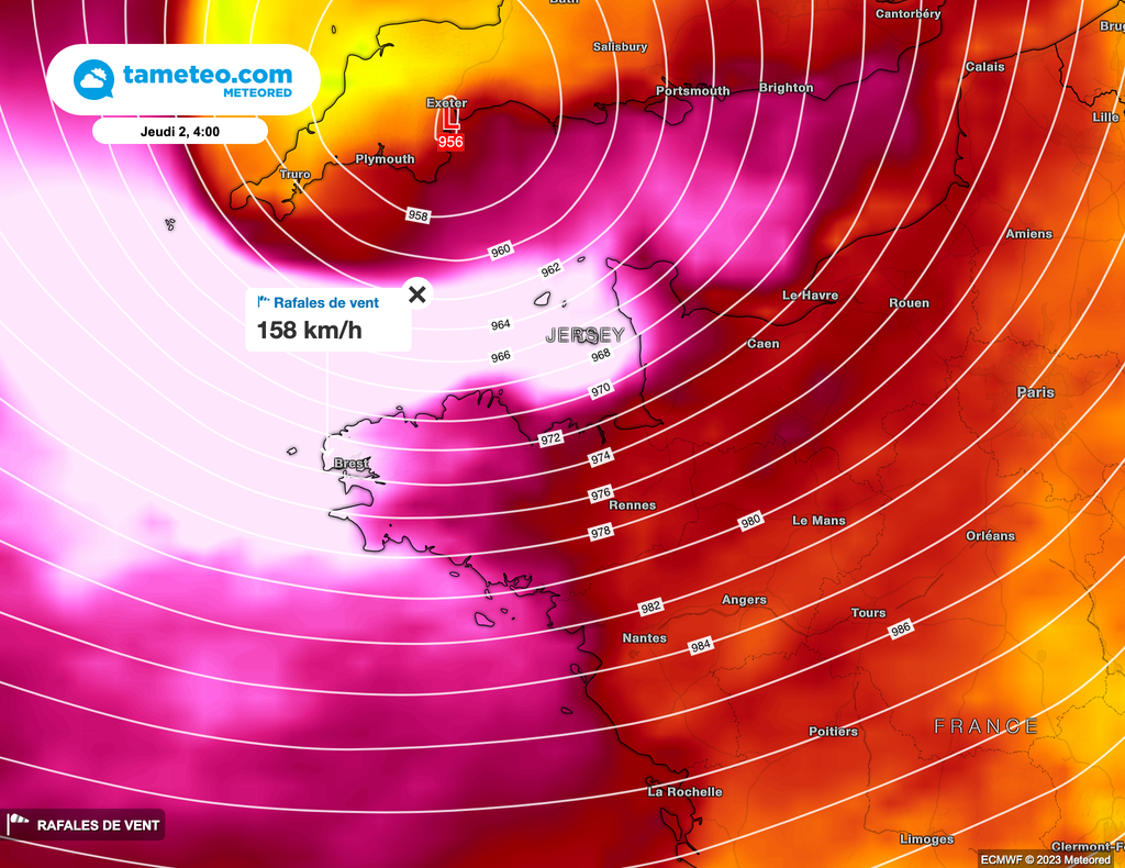 Tout au long de la nuit, les conditions météo resteront dominées par la tempête Ciaran sur le Nord-Ouest de la France. Certaines sorties numériques optent pour des rafales parfois proches voire ponctuellement supérieures à 150km/h du côté de Brest.