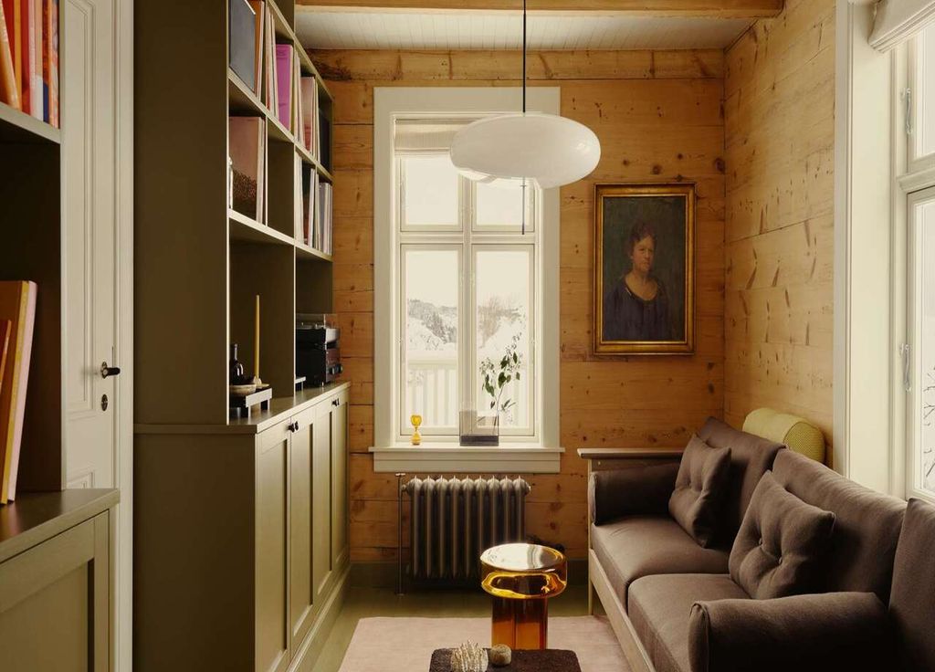 Le salon, avec sa cheminée et ses sièges moelleux, offre un endroit où se poser. Dans la bibliothèque, à mi-chemin entre salle de lecture et bar informel, cohabitent livres, spiritueux, disques et croquis de la flore nordique.