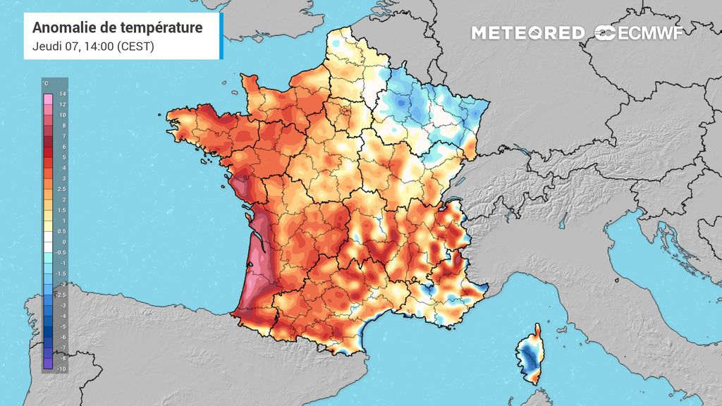 Vendredi après-midi, les températures prévues atteindront jusqu’à 40°C à Montauban et Agen, 39°C à Toulouse et Auch, 38°C à Bordeaux, 37°C à La Rochelle, Clermont-Ferrand, Lyon et Tarbes, 36°C à Limoges et Grenoble, 35°C à Aurillac et Bourges, 33°C à Tours, 31°C à Nancy, Strasbourg et Paris, 30°C à Alençon et Toulon, 29°C à Perpignan, 28°C à Rennes, 26°C à Rouen, 23°C à Brest, 22°C au Havre et 21°C à Cherbourg.