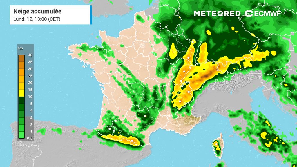 Dès 300 à 400 mètres, il faut s’attendre à 3 à 7 centimètres de neige, localement 10 centimètres en se dirigeant vers les premières hauteurs et vers le pays de Montbéliard. De 10 à 20 centimètres de neige sont prévus entre 400 et 500 mètres d’altitude. Il pourrait tomber de 20 à 40 centimètres de neige au-dessus de 500 mètres d’altitude.