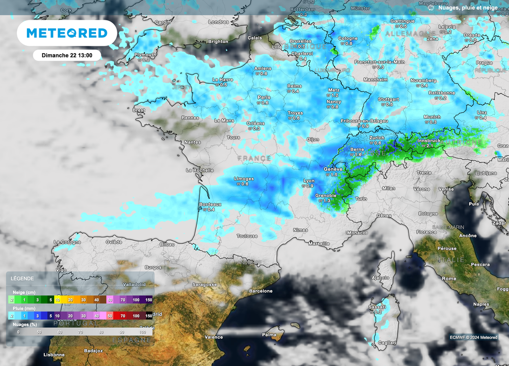D'ici ce week-end, de nouvelles perturbations s'annoncent. Alors que la pluie va dominer jusqu'à samedi, la présence d'un air encore plus froid dimanche pourra favoriser la présence d'un risque de giboulées. De bonnes chutes de neige concerneront les différents reliefs de l'est de la France.