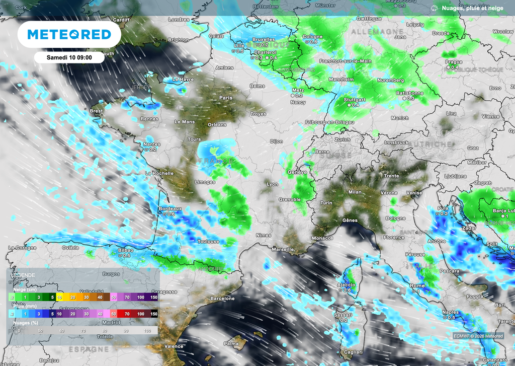 La pluie devrait néanmoins se confirmer dans l'ouest pour demain jeudi avec des températures bien douces. Cela s'explique par un flux dynamique de sud-ouest. Plus à l'est, on pourra retrouver un peu de neige en plaine jeudi matin (première partie de matinée). Toutefois, là aussi des pluies verglaçantes sont à prévoir.