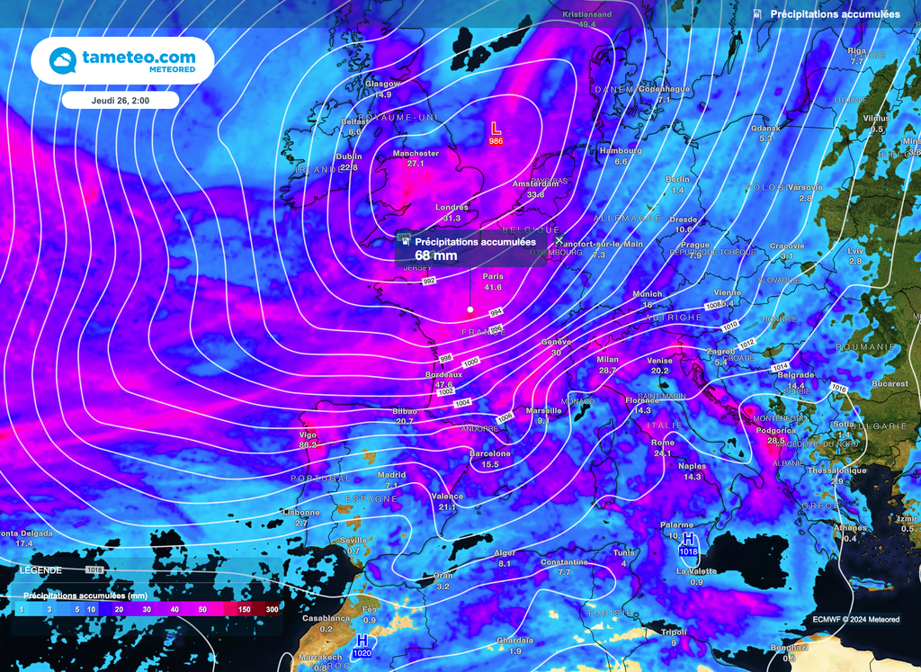 Elle apportera un renforcement des rafales de vent mais aussi des accumulations de précipitations. Ainsi, si l'on se réfère au modèle européen ECMWF, on pourrait localement atteindre d'ici la nuit de mercredi à jeudi l'équivalent de 1 mois de précipitations soit environ de 60 à 70mm.