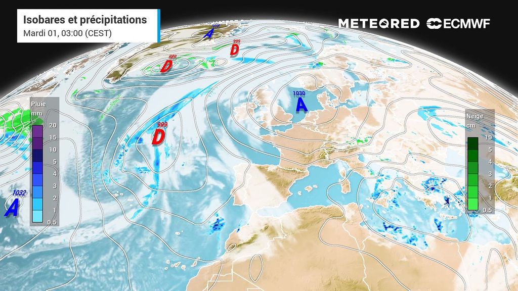 Ce blocage anticyclonique en oméga correspond à un axe de hautes pressions qui s’étire de l’Algérie aux îles Britanniques en passant par la France. Cet anticyclone est cerné par des gouttes froides, l’une positionnée sur la péninsule Ibérique, l’autre sur l’Europe de l’Est. Ce blocage en oméga empêche d’ailleurs toutes les dépressions d’atteindre la France : elles sont contraintes de le contourner par le sud, en circulant par la péninsule Ibérique.