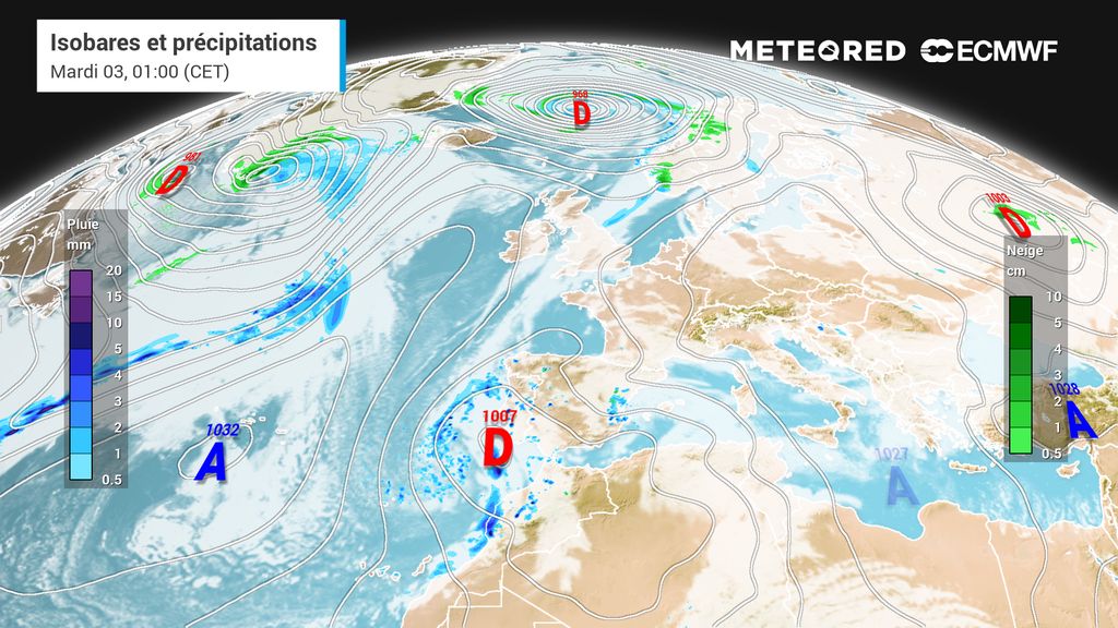 Lundi, quelques averses sont prévues sur les Pyrénées et la Corse, en lien avec cette humidité sur le Sud de l'Europe, et des entrées maritimes pourraient lâcher quelques gouttes du Languedoc-Roussillon aux Cévennes, poussées par le vent marin. Mardi, quelques averses pourraient encore toucher le quart Sud-Est et les Pyrénées, en englobant cette fois-ci l'Auvergne-Rhône-Alpes et PACA.