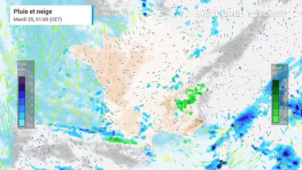 La perturbation concernera une bonne moitié sud et est de la France avec de la neige seulement en montagne. Dans les plaines, de la pluie régulière se présentera avec une sensation bien fraîche voire froide dans le nord-est en raison de températures qui resteront basses.