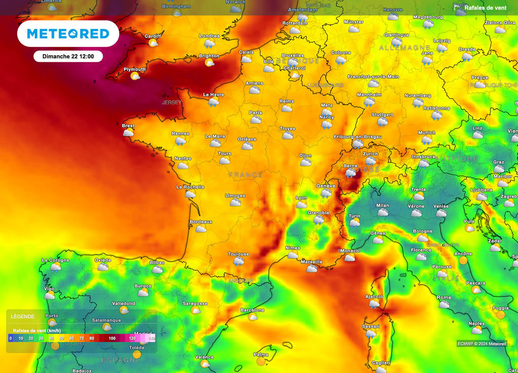 Pour la matinée de ce dimanche, les conditions météo en France s'annoncent pluvieuses et venteuses. En effet, dans un flux de secteur nord à nord-ouest une perturbation active traverse la France du nord au sud.