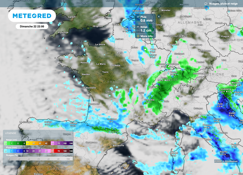 Des cumuls de pluies modérés qui, en direction des différents reliefs, se traduira par une bonne couche de neige fraîche. Une bonne nouvelle pour le début des vacances scolaires mais prudence si vous vous rendez en montagne.