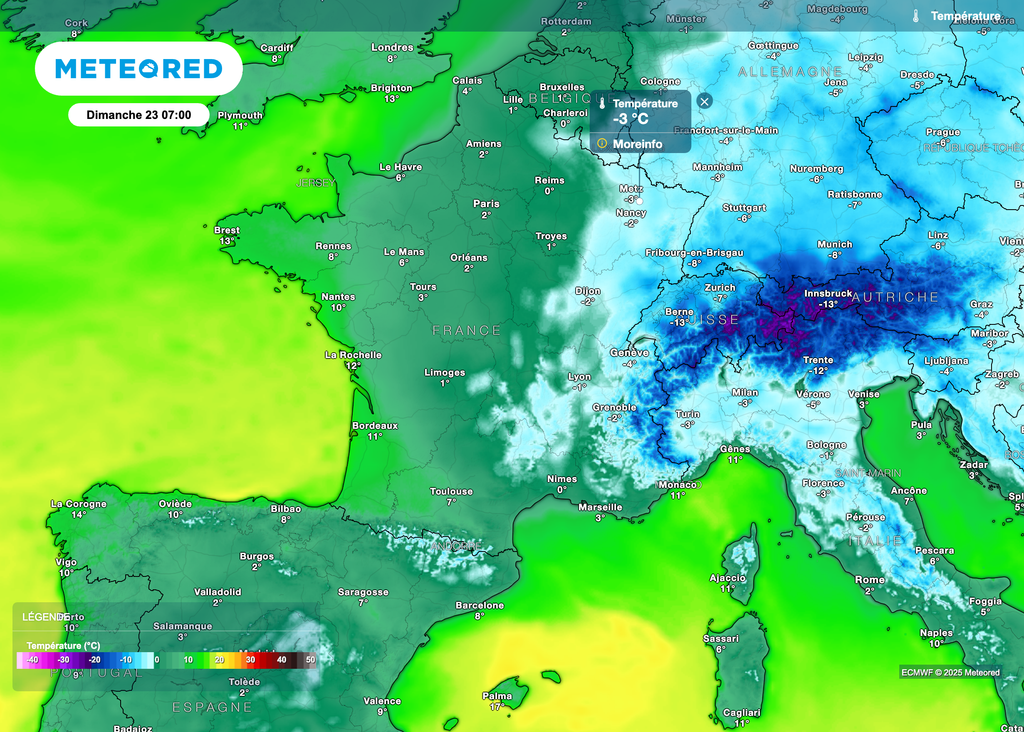Samedi devrait être la journée la plus froide de la semaine à l'échelle de la France. Dès dimanche, un air plus doux arrivera par l'ouest. De fait, on retrouvera 10°C voire un peu plus le long du littoral breton et atlantique. Un peu plus dans les terres, les températures seront généralement comprises entre 3 et 7-8°C.