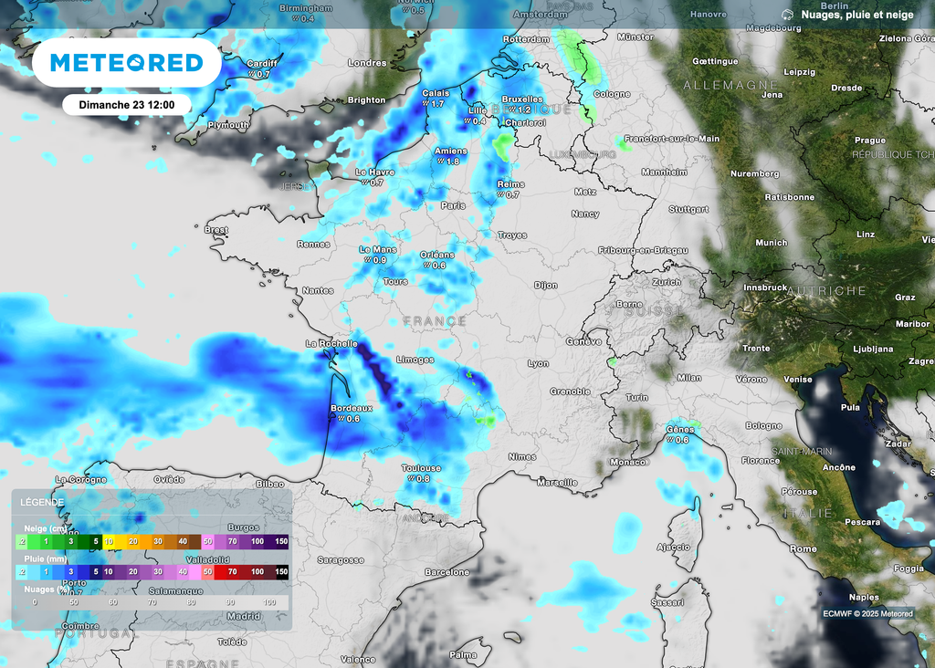 C'est en cours de matinée qu'une perturbation progressera d'ouest en est. Elle pourra engendrer quelques phénomènes glissants à l'ouest d'une ligne Lille / Toulouse, là où les sols auront été les plus froids. Restez donc prudents bien que ce risque soit local. Des chutes de neige pourront aussi s'inviter mais un peu plus à l'est.