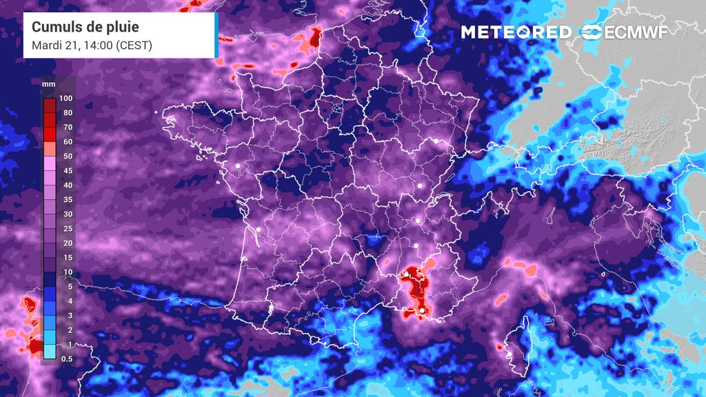 De plus, les quantités de pluie pourront rapidement devenir conséquente. En direction de l'Ardèche, certaines modélisations optent pour 70 à 80mm d'ici le milieu de matinée. Plus généralement, de 50 à 70-80mm sont prévus dans la journée sur un bon quart sud-est.