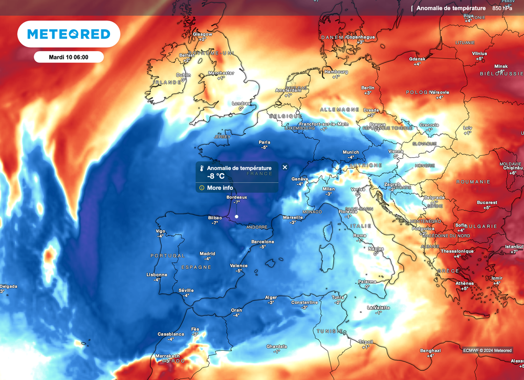 En regardant l'anomalie des températures vers 1500m, on constate que c'est une poche d'air bien froid pour la période qui s'invitera. Le déficit par rapport aux valeurs de référence serait de l'ordre des -8°C en direction du sud-ouest, -5°C au-dessus de Paris.