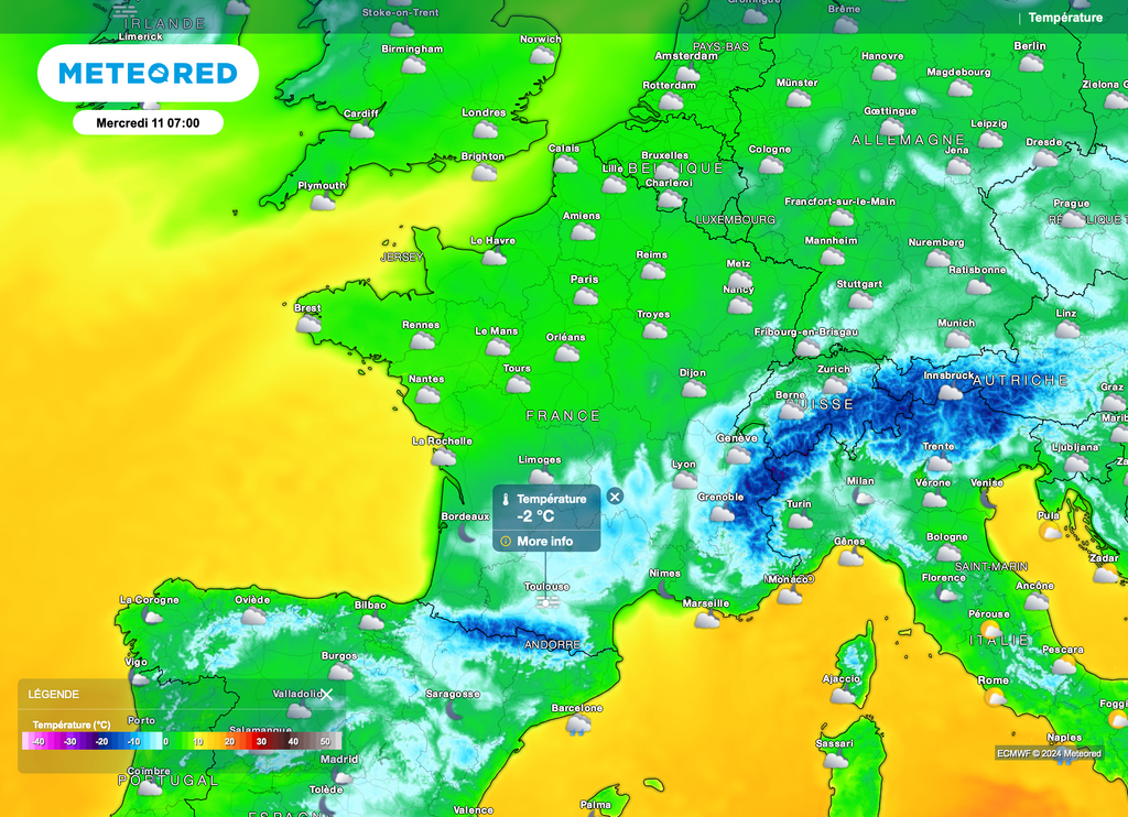 Par contre, la moitié sud aura un ciel nocturne plus dégagé. Ainsi, des gelées sont attendues y compris dans la ville rose qu'est Toulouse. Mercredi matin, le mercure pourra atteindre les -1°C, un peu moins dans les campagnes voisines.
