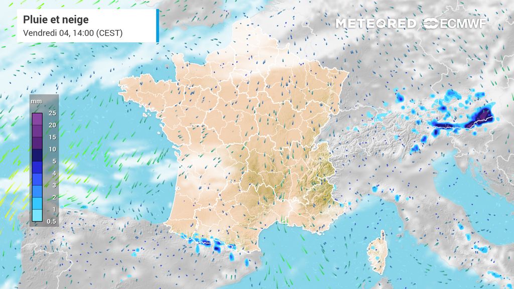 Il faudra ainsi surveiller dans un premier temps les régions allant de l'Est des Pyrénées, Occitanie, Auvergne, Massif Central, Bourgogne et Champagne-Ardenne. Plus classiquement, des orages se déclencheront aussi sur les reliefs de l'Est, entre les Vosges, le Jura, les Alpes et les hauteurs de la Provence, là encore parfois forts et accompagnés de grêle.
