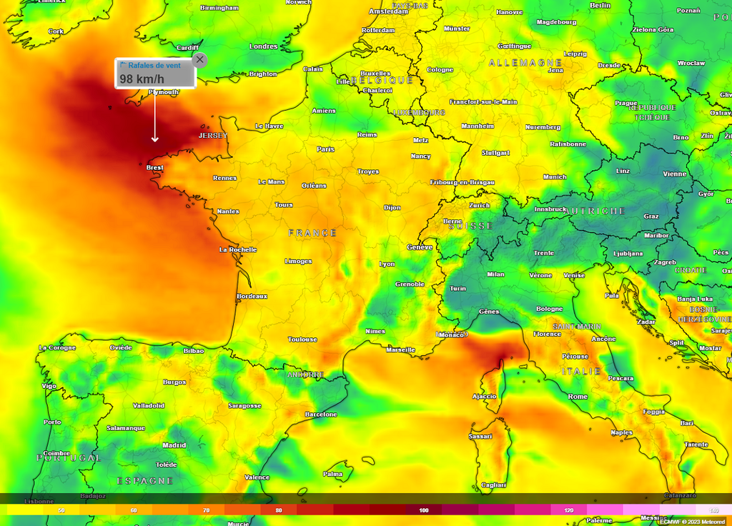 Les rafales se sont d'ailleurs déjà montrées puissantes ce mercredi en journée, au passage d'une perturbation pluvieuse dans le nord-ouest. Ainsi, des bourrasques s'approchant des 100 km/h ont pu être observées dans les parages du Cap Gris-Nez (Pas-de-Calais) et de Fécamp (Seine-Maritime). Cette même situation se répétera dans le ciel de traîne jeudi et surtout vendredi, lorsqu'un minimum dépressionnaire circulera sur le sud des îles britanniques. Le vent atteindra alors 100 km/h en bord de Manche et 70 km/h voire localement davantage dans les terres du nord-ouest.