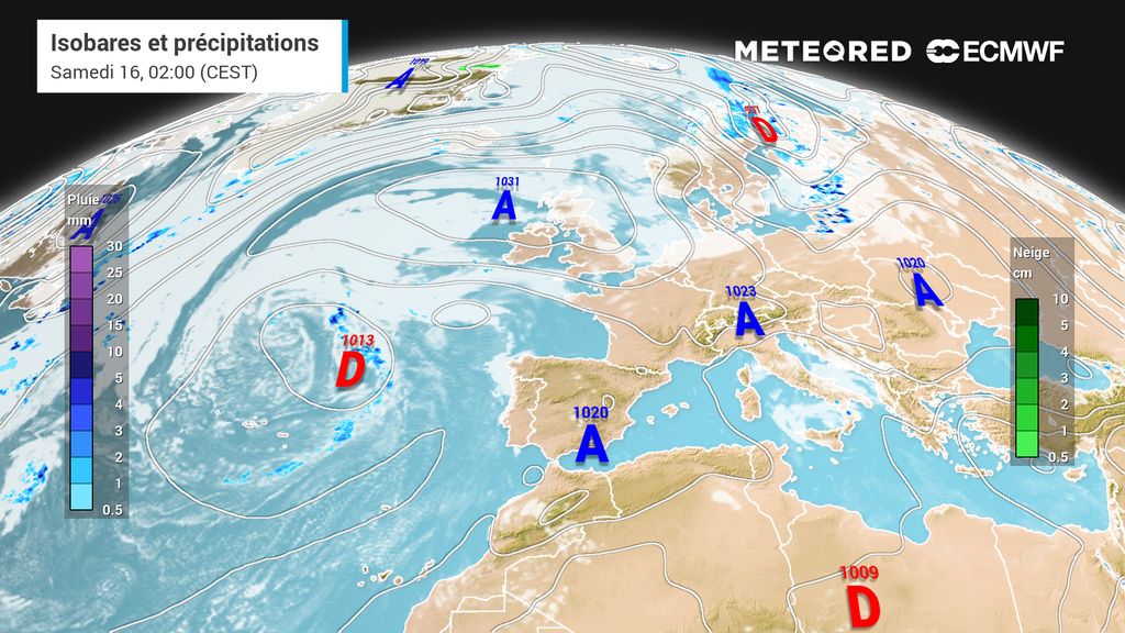 D'ici le milieu de semaine prochaine, les hautes pressions auront bien plus de mal à éviter la formation de perturbations parfois orageuses près de la France. L'hexagone devrait même renouer avec un classique dégradé nord /sud. Des passages d'intempéries qui sont à surveiller puisqu'ils pourraient se montrer forts.