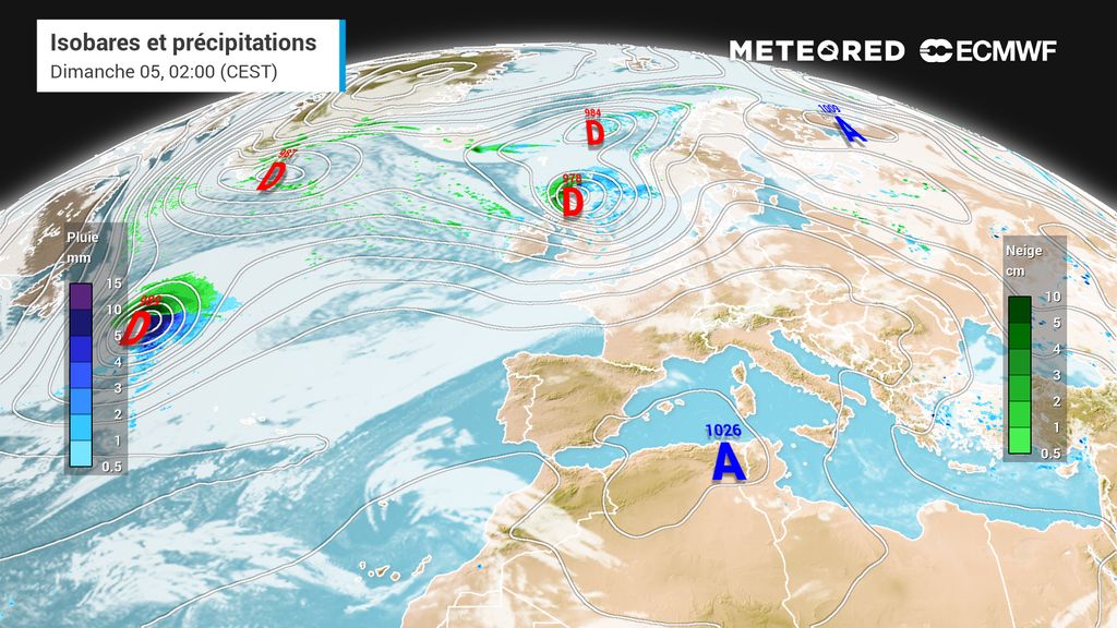 C'est ce que l'on constate sur cette seconde carte issue du modèle européen ECMWF. De plus, un contexte plus dépressionnaire se mettra en place par l'ouest de la France.