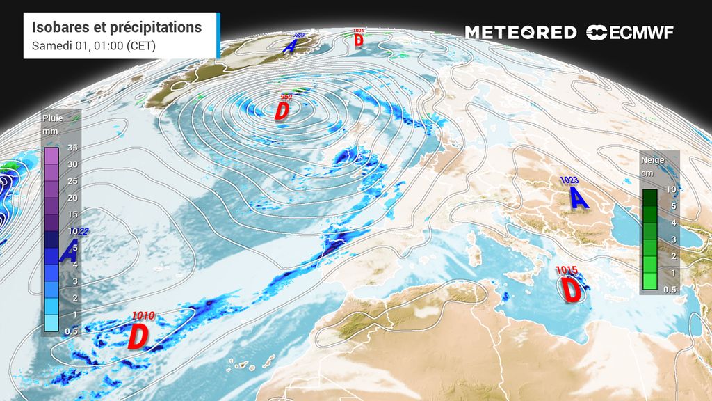 Entre samedi et dimanche, l'indice NAO se rapprochera de zéro, avec une dépression proche de l'Islande et un anticyclone se reformant sur les Açores : une perturbation devrait donc traverser le pays samedi, suivie d'averses dimanche. Si la Méditerranée subit encore des pluies samedi, cela ne sera plus le cas dimanche autour du Golfe du Lion, preuve du changement de régime en cours.