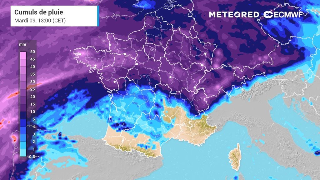 Enfin, mardi, un nouveau front chaud s'invitera sur le pays, mais avec le flux se redressant au Sud, il ne concerna qu'une infime partie du pays : seulement les régions bordant la Manche, à savoir Bretagne, Normandie et Hauts-de-France, avec des pluies faibles et localisées. Quelques ondées s'inviteront très localement en marge, de la région parisienne au Grand-Est, alors que dans le même temps, des entrées maritimes apporteront quelques gouttes du Languedoc aux Cévennes.