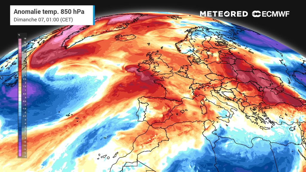 Dans cette configuration, c'est un air doux voire très doux qui sera advecté jusqu'en France. Ainsi, les projections atmosphériques font état de températures supérieures à 10°C à l'altitude 850hPa.