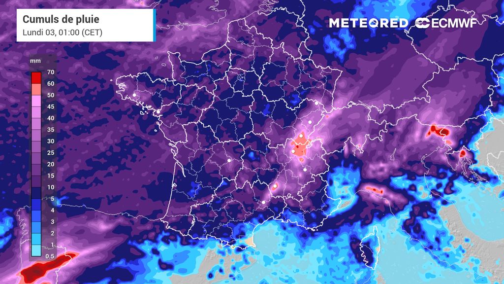 Les précipitations se feront un peu moins présentes (retour probables d'éclaircies) dans la vallée du Rhône (et plus largement dans le quart sud-est avec ces nouvelles pluies parfois marquées) mais prudence en raison des réactions parfois décalées des cours d'eau. La pluie concernera plutôt la Côté d'Azur d'ici le milieu de journée.