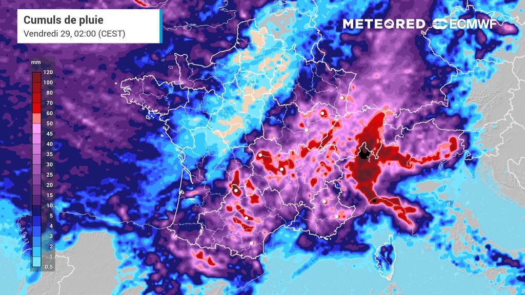 À l'inverse de la précédente dégradation, celle de la nuit de mercredi à jeudi ne se dirigera pas vers la Bourgogne-Franche-Comté mais plutôt vers le quart sud-est du pays. Ainsi, dans ces régions, pluies et orages sont attendus en fin de nuit et durant la matinée de jeudi. Plus que l'activité orageuse, ce sont les intensités pluvieuses qui devront être suivies de près. Elles s'annoncent, en effet, fortes, ce qui laisse craindre des phénomènes de ruissellements.