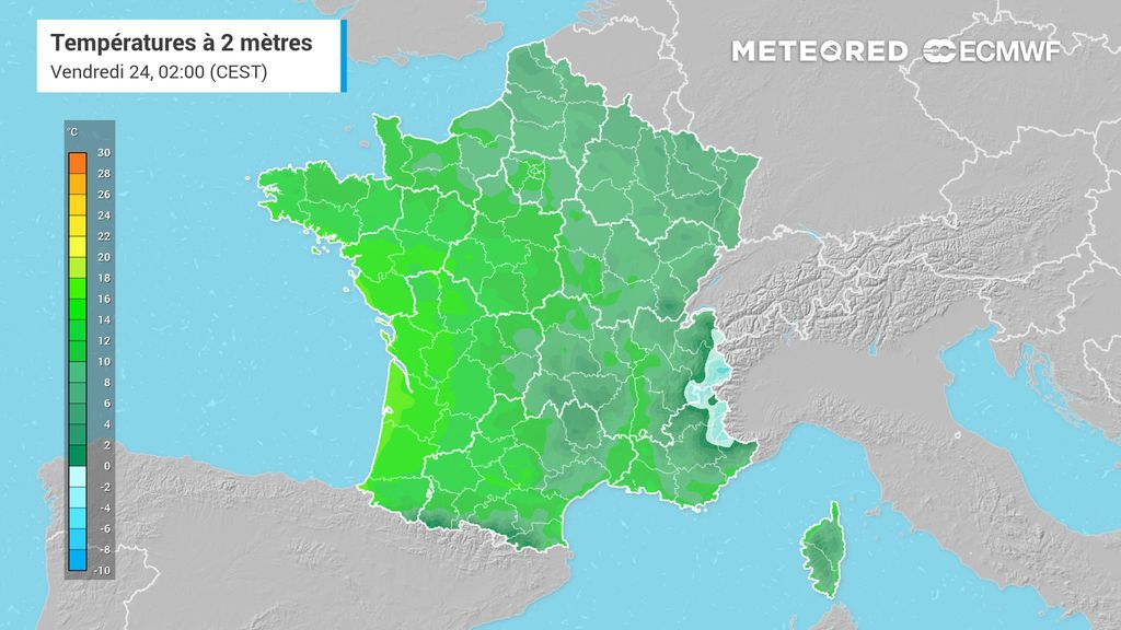 L'amplitude thermique pourrait parfois dépasser les 20°C entre matin et après-midi dans le Nord-Est. Au plus chaud de la journée, il fera donc 18°C à Cherbourg, 19°C à Abbeville, 20°C à Lille, Rouen, Nancy, Nice et Montpellier, 21°C à Perpignan et Besançon, 22°C à Marseille, Grenoble, Strasbourg et Ajaccio, 23°C à Paris, Brest, Lyon, Clermont-Ferrand et Toulouse, 24°C à Bourges et Nantes, 25°C à Agen et Tarbes, 26°C à Limoges, 27°C à Bordeaux, Biarritz et Cognac.