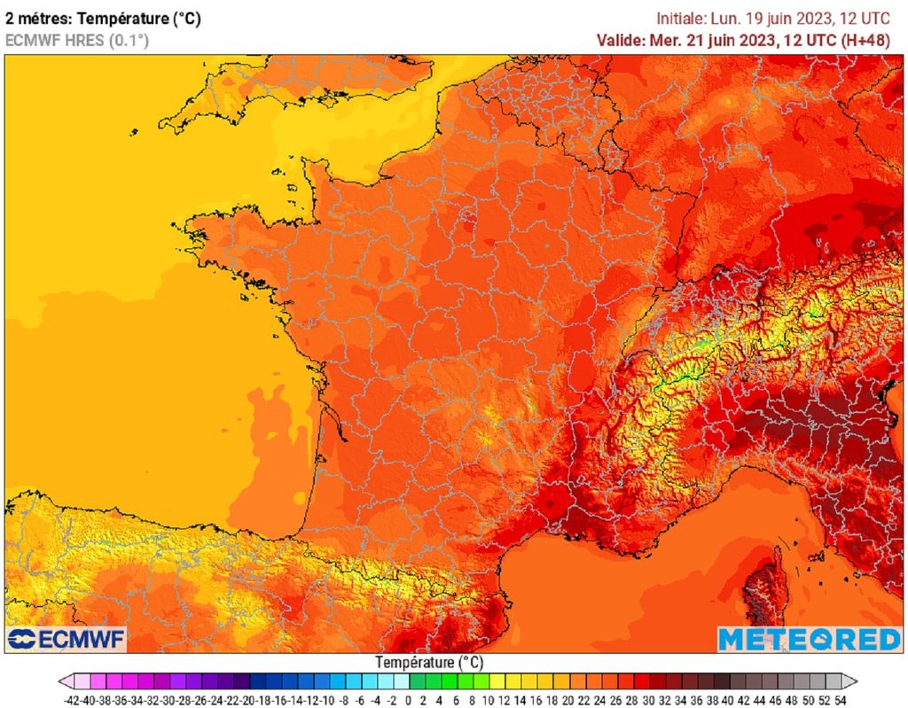 Partout ailleurs, côté continent, les maximales seront bien plus respirables avec des maximales de l’ordre de 20 à 27°C dans le quart nord-ouest et entre 26 et 33°C ailleurs, avec des pics à 34°C en Alsace ou encore 35°C dans le Dauphiné. Mercredi, le mercure n’évoluera pas beaucoup avec le maintien du coup de sirocco en Corse et des pointes à 40°C tandis que les valeurs baisseront légèrement au sud-ouest. Ailleurs, la situation sera inchangée par rapport à la veille avec une chaleur souvent modérée.