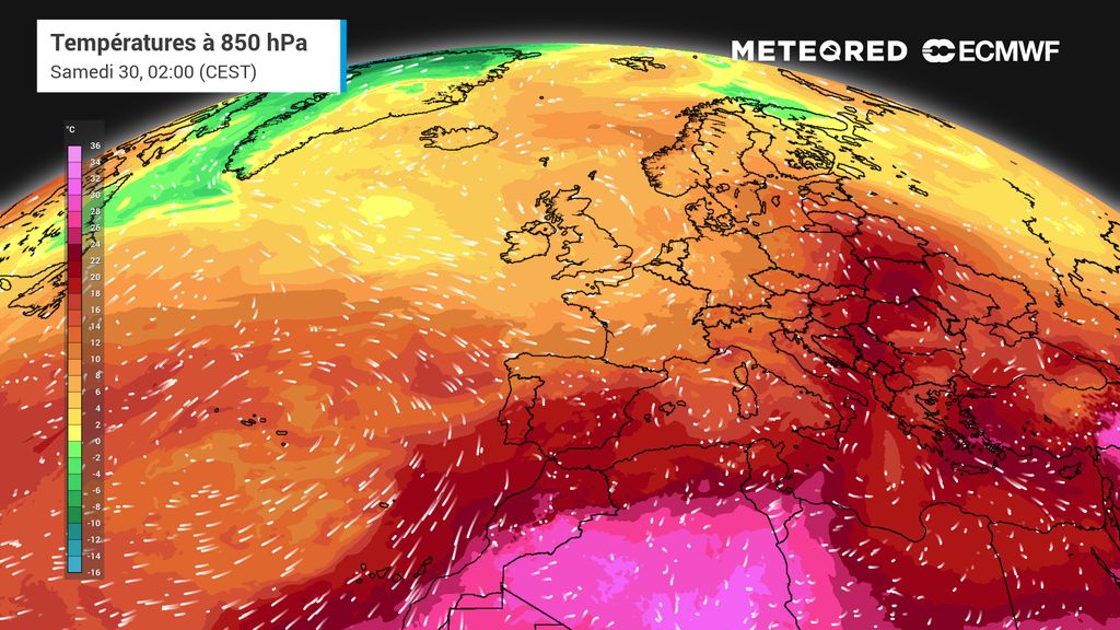 Il est prévu ce lundi après-midi 25°C à Brest, 26°C à Nancy et à Nice, 27°C à Alençon, au Havre et à Paris, 28°C à Caen, 29°C à Rennes, Tours et Marseille, 30°C à Tarbes et Montélimar, 31°C à Nantes, Lyon et Clermont-Ferrand, 32°C à Limoges et Toulouse, 33°C à Montauban et 34°C à Auch et Bordeaux. Localement, en Nouvelle-Aquitaine, des pointes à plus de 35°C sont possibles.