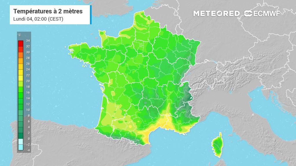 Mercredi, l'anticyclone va pleinement s'étaler sur une grande partie de l'Europe du Sud, faisant à nouveau remonter de l'air extrêmement chaud en provenance d'Espagne. Alors que la moitié Nord sera toujours épargnée avec des valeurs de saison, la moitié Sud subira de très fortes chaleurs, avec une moyenne de 33°C l'après-midi, avant une hausse encore plus importante jeudi.