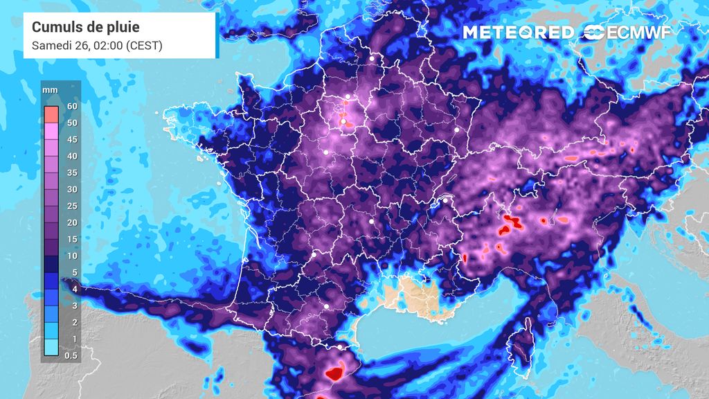 Selon certains scénarios, les cumuls pourraient approcher les 60 à 80 litres d’eau par mètre carré, voire ponctuellement atteindre les 90 litres.