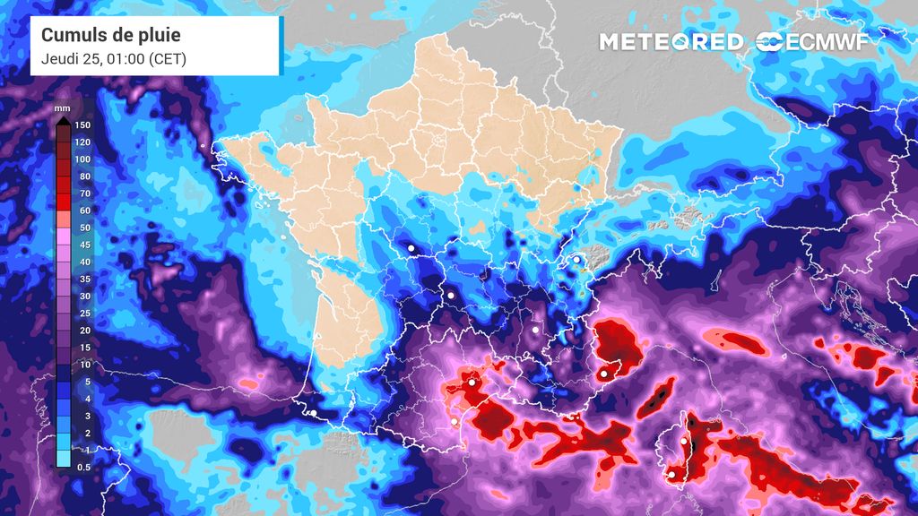 L’épisode méditerranéen se poursuit dans le sud-est de la France et les cumuls de pluie deviennent par endroits conséquents. En l’espace de trois jours, il est tombé localement près de 400 litres d’eau par mètre carré. Cet épisode méditerranéen se distingue donc par son caractère exceptionnel, en raison de son arrivée très tardive dans l’année, de sa durée et de l’intensité des pluies associées.
