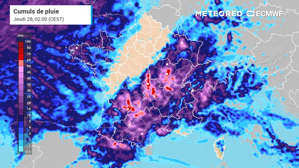 Du nord de l'Occitanie jusqu'au Massif central ainsi que dans les départements alpins et jusqu'à la Côte d'Azur, des cumuls proches de 100 mm seront possibles localement, d'où un risque de crue-éclair dans les zones de relief et alors que les sols sont particulièrement secs en cette fin d'été. Ce paramètre vient accentuer le risque de ruissellements.