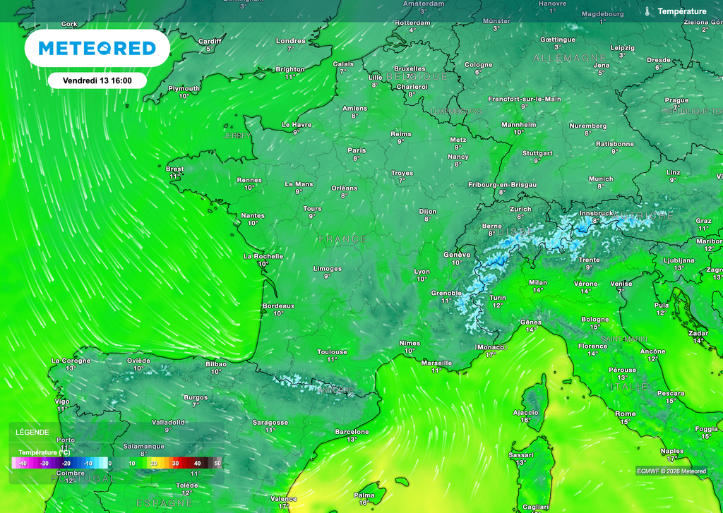 En fin d'après-midi, comptez par exemple 7°C sur Calais, 8°C à Amiens et Orléans ou bien encore Dijon. 9°C sont prévus sur Metz et Limoges et 10°C sur Bordeaux ou Nîmes. Douceur un peu plus présente sur Brest et Toulouse avec 11°C. Sur Ajaccio, les thermomètres pourront afficher 16°C et même 17°C sur Monaco.