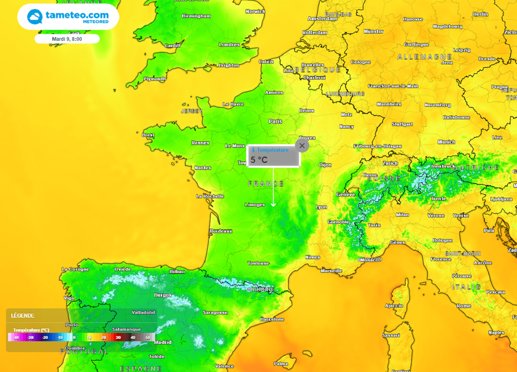 En début de semaine prochaine, les températures chuteront lourdement. Malgré cela, les valeurs resteront positives en plaine au réveil. Une nouvelle hausse du mercure est envisagée à l'approche du week-end suivant avec un flux s'orientant au secteur sud-est ou sud, à l'image de ce qu'il se passe actuellement en France.