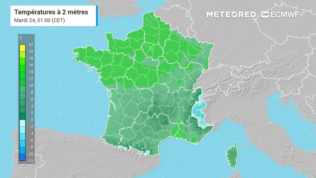 Bien que l'on va observer une baisse des températures, le conflit de masses d'air ne sera pas suffisant pour observer une dégradation orageuses étendue. Cela étant, on ne peut exclure des précipitations à caractère orageux voire très localement un orage.