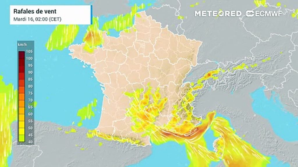 En effet, le flux de sud s’annonce particulièrement puissant. Des rafales proches de 100 km/h sont attendues dans le sud-ouest du pays, en direction des Pyrénées. Le vent d’autan soufflera avec des rafales proches de 70 km/h. Ce flux de sud fera à nouveau remonter de l’humidité de Méditerranée avec des pluies attendues sur les Cévennes.