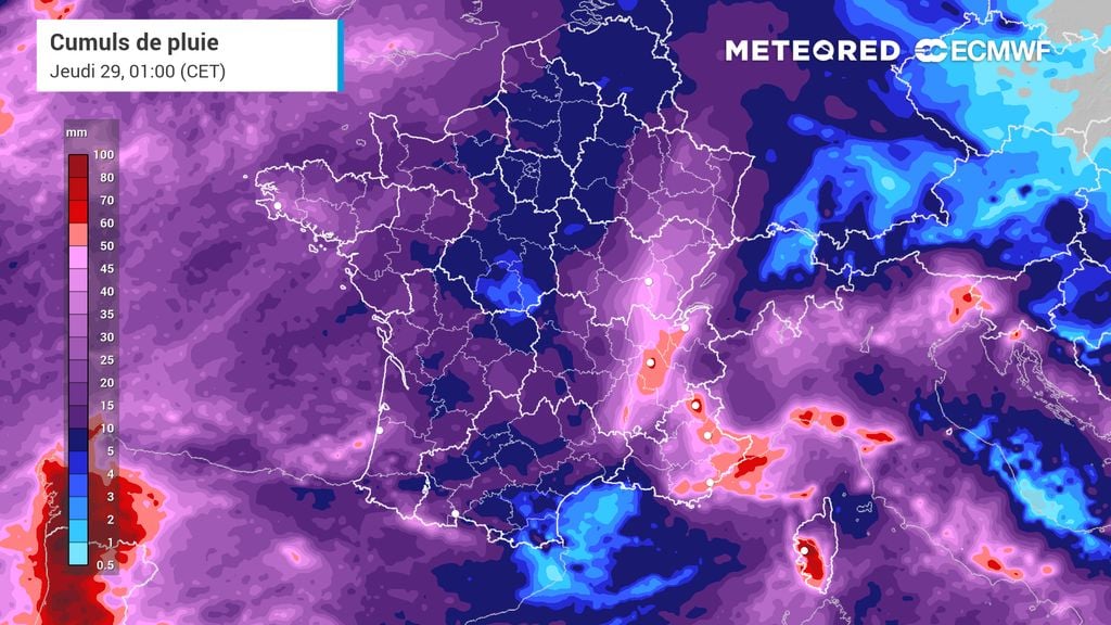 Au cours des 7 prochains jours, les quantités de pluies attendues s'approcheront des 100 mm sur l'ouest de la Bretagne, sur le sud de l'Aquitaine, vers le Limousin ou encore sur une partie de la région Rhône-Alpes et l'ouest de la Corse. Ailleurs, les pluviomètres recevront souvent entre 40 et 60 mm tandis que les quantités seront nettement moins importantes autour du golfe du Lion et de la Touraine jusqu'au nord de la Seine.