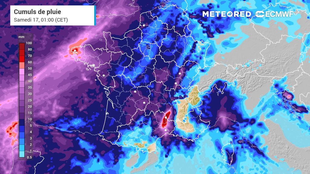 Dans la nuit de vendredi à samedi, les pluies se renforceront sur les secteurs précédemment cités tandis que d'autres précipitations remonteront depuis la Grande Bleue en direction du Var où elles pourront d'ailleurs prendre un caractère orageux. Elles se maintiendront toute la journée, en s'étendant parfois jusqu'à la Côte d'Azur tandis que les pluies resteront soutenues sur les Cévennes.