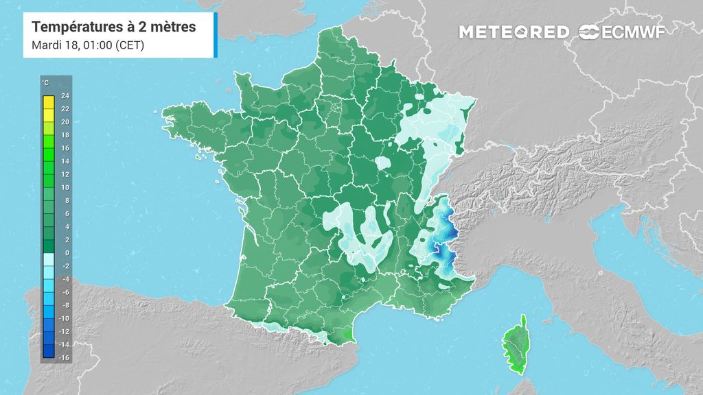 Les minimales pour mardi devraient se situer entre -2°C et -1°C dans les campagnes françaises, plus précisément entre Bourgogne-Franche-Comté et Grand-Est. Localement, les températures peuvent se montrer un peu plus froides. Dans l'ouest, les minimales pourront s'approcher des 0°C voire se situer légèrement en-dessous.
