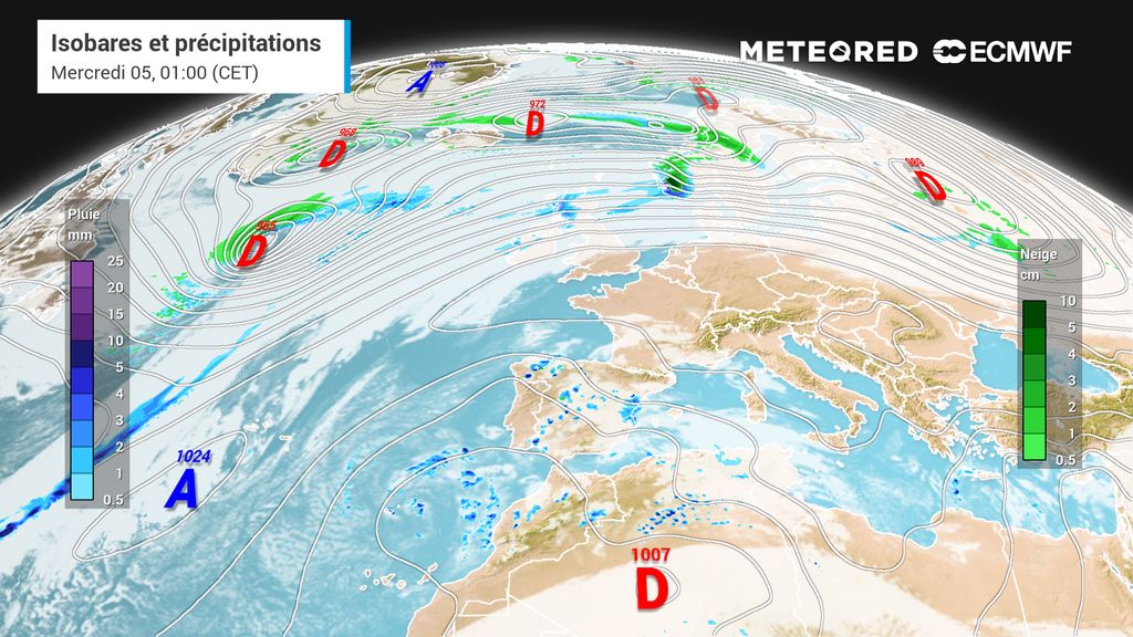 D'ici la journée de vendredi, on va retrouver un début d'influence d'une zone dépressionnaire. Positionnée à proximité de l'Espagne et du Portugal, elle aura tendance à apporter un ciel plus nuageux à couvert entre la région Occitanie et la Bretagne. Quelques précipitations pourraient s'observer.